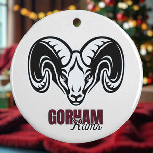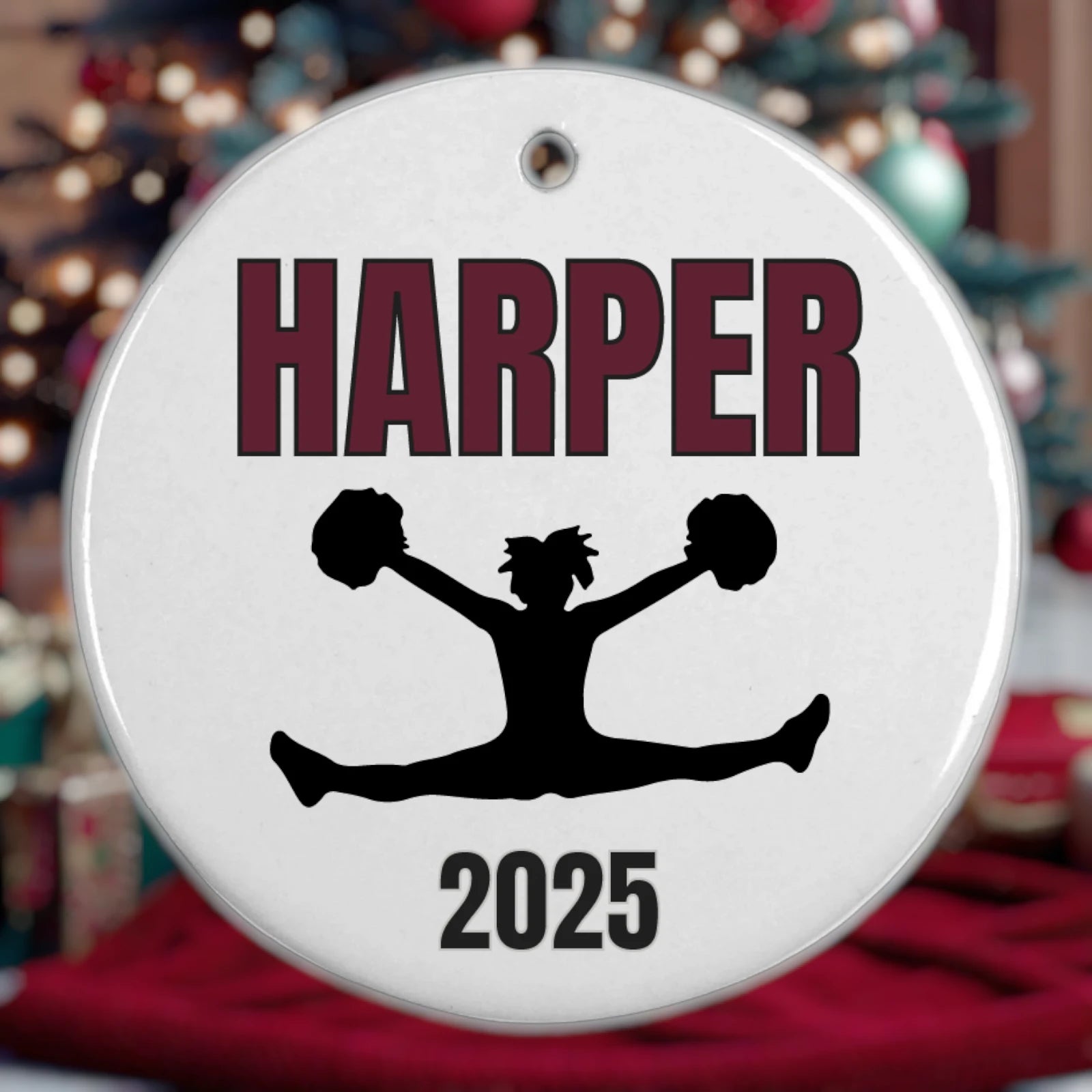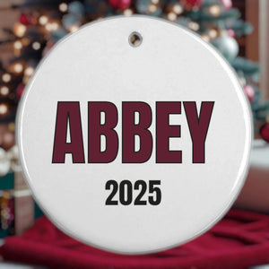 Personalized 3" double-sided ceramic Christmas Ornament - All ornaments come with a maroon ribbon for hanging.
